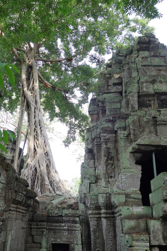 Pathways lead into halls partially reclaimed by the jungle at Ta Prohm