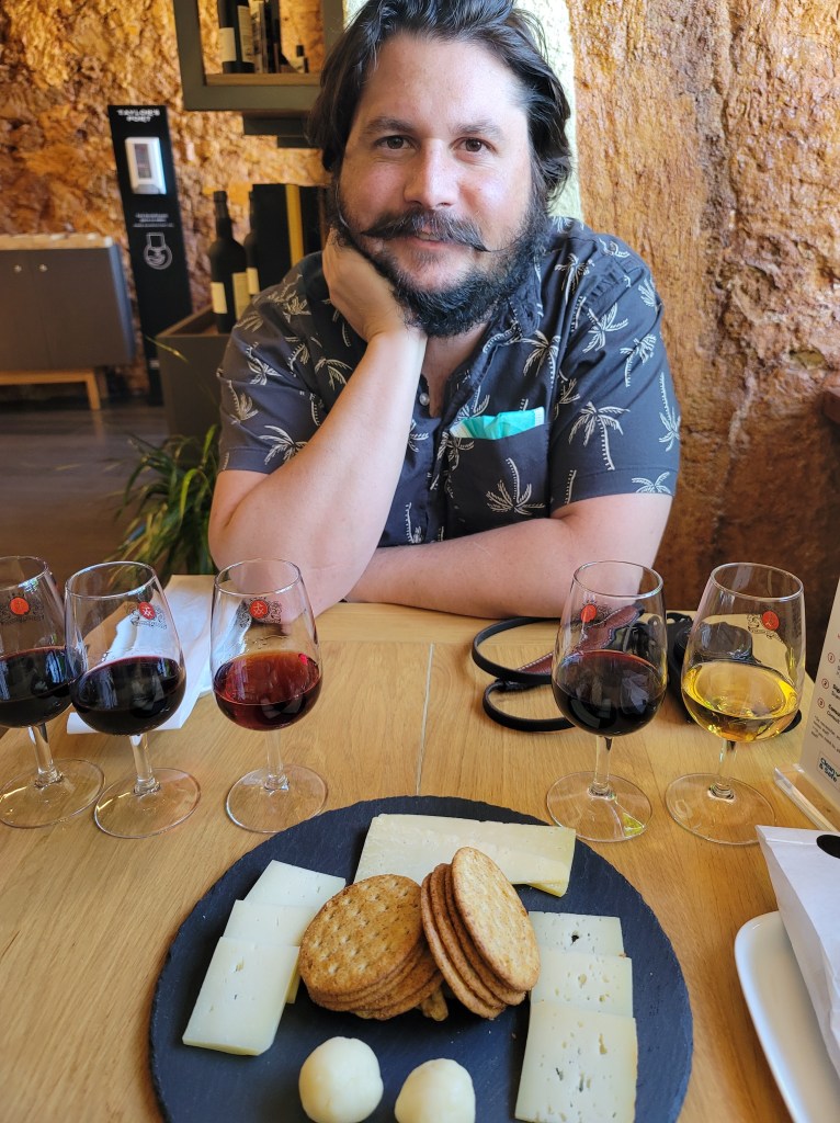 Well, we couldn’t spend any amount of time in Portugal without doing a dive into Port. Luckily for us, a Taylor Port tasting room was a few doors down from our hotel. The tasting room is small but modern and very inviting, with nods to the history of the brand throughout the space. Port wine is a Portuguese fortified wine produced in the Douro Valley in the north of Portugal. It is most often seen as a sweet red wine, often served with dessert, although it can come in dry, semi-dry, and white varieties. We ordered a full tasting, with 5 ports, for €40 (we also added on a killer selection of Portuguese cheeses for an extra €14).
