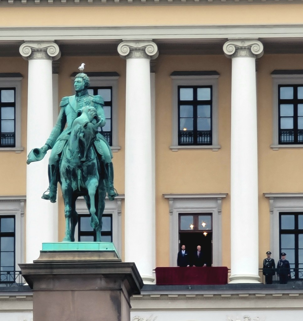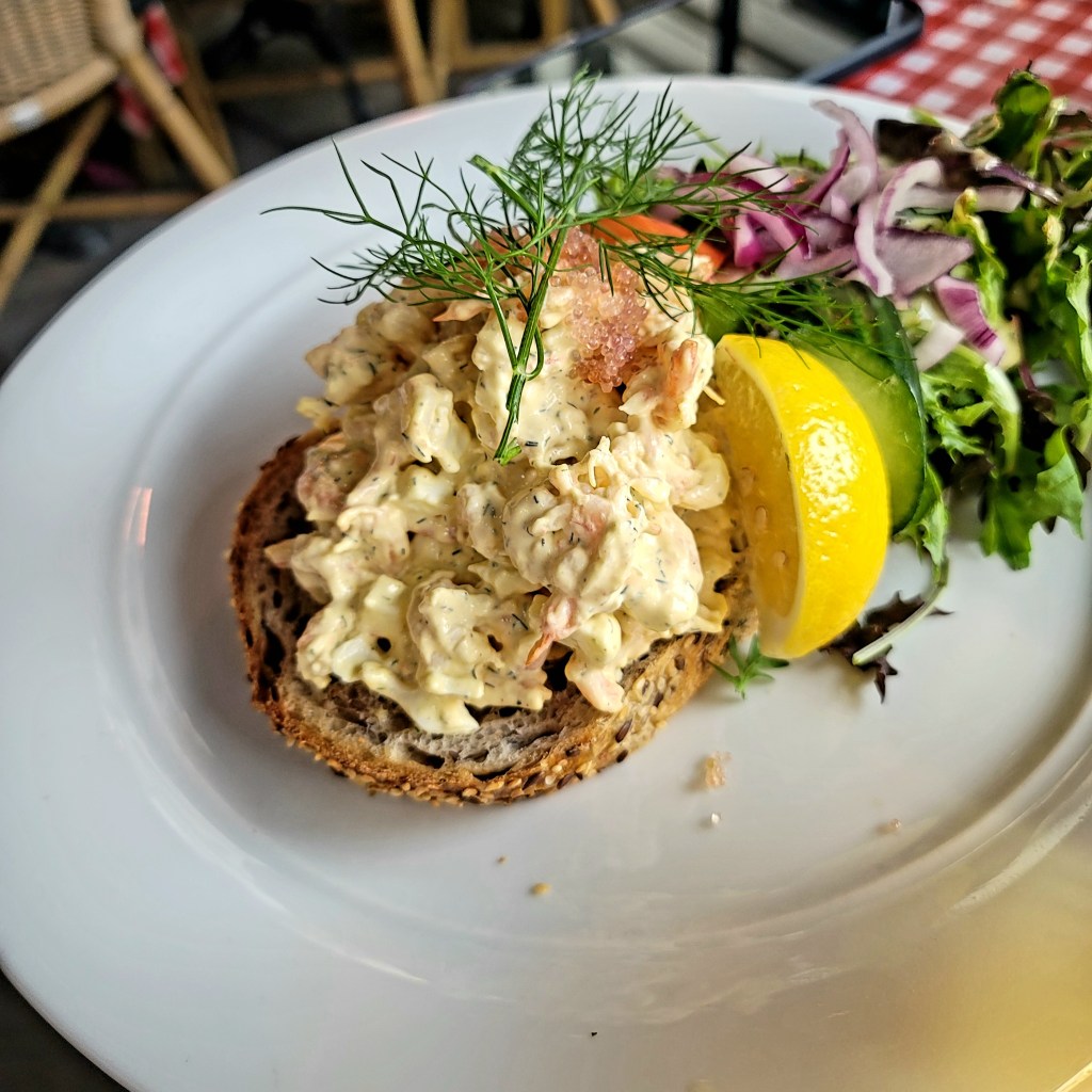 On the way our last stop, we passed through the palace grounds and got to see a rare site– the Norwegian King, Harold V, on the balcony addressing the press and trooping his guard. The final meal on our food tour was at Lorry, a quirky restaurant near the Royal Palace. The decor was like a Norwegian Cracker Barrel meets Hard Rock Cafe, but instead of guitars, it was adorned with art. Here, we were introduced to a very common Norwegian dish, Smørrebrød, a type of open-faced sandwich. David had one with prawns, and I had one with bacon/eggs. Both were definitely unique and full of flavor (+ all the mayo).