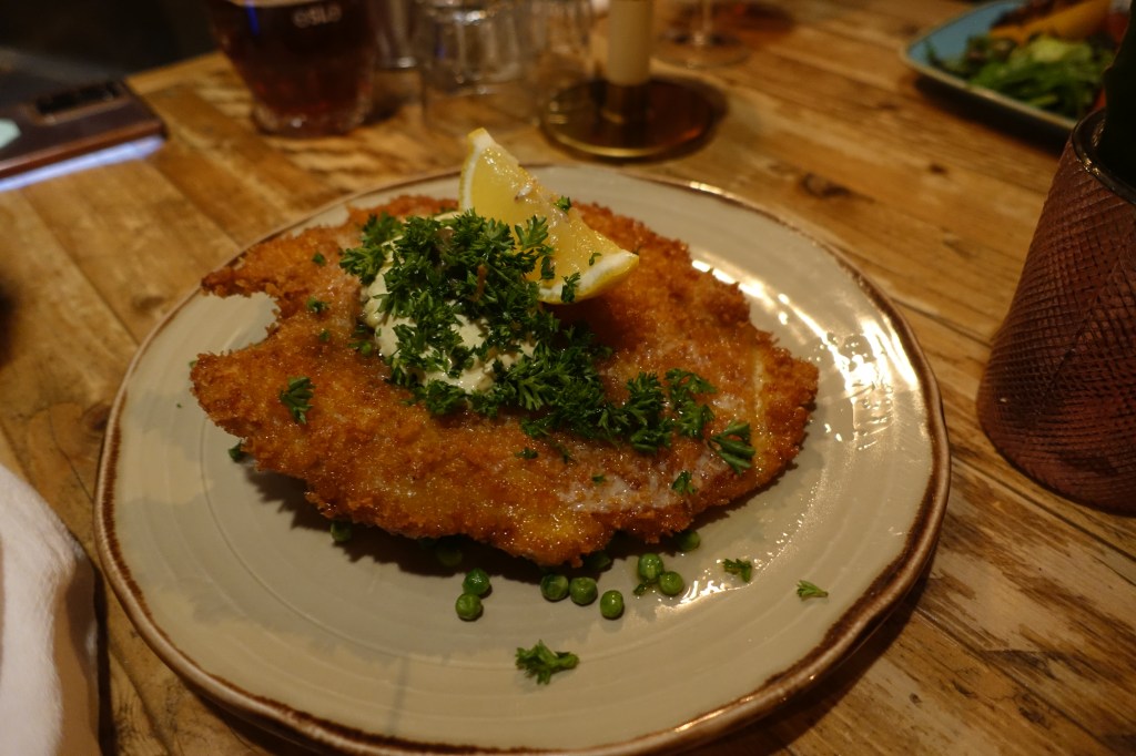 Our “nice” meal for the trip was at Den Glade Gris – a cozy restaurant located in Grünerløkka. Known for their traditional Norwegian fare and hearty pork dishes. There is whale on the menu, in Norway whale hunting is legal and they claim that it is done in a sustainable way. If you are interested in trying whale – this is the sort of place to do it. We had schnitzel and trout. The trout was served smoked and cold – it reminded David of lox. The real star here is their extensive beer menu and recommended beer pairings. It is clear that a lot of thought is put into the beer here and we were glad to see it.