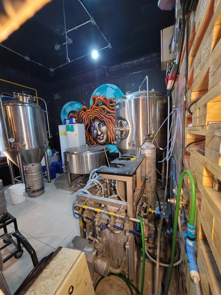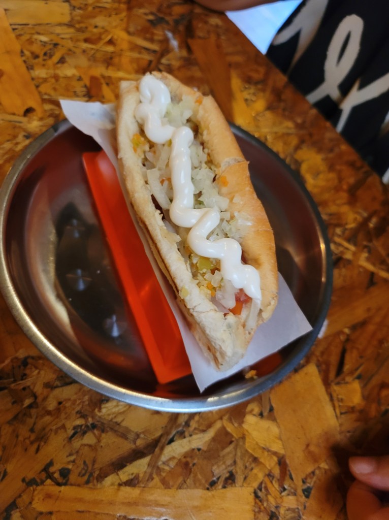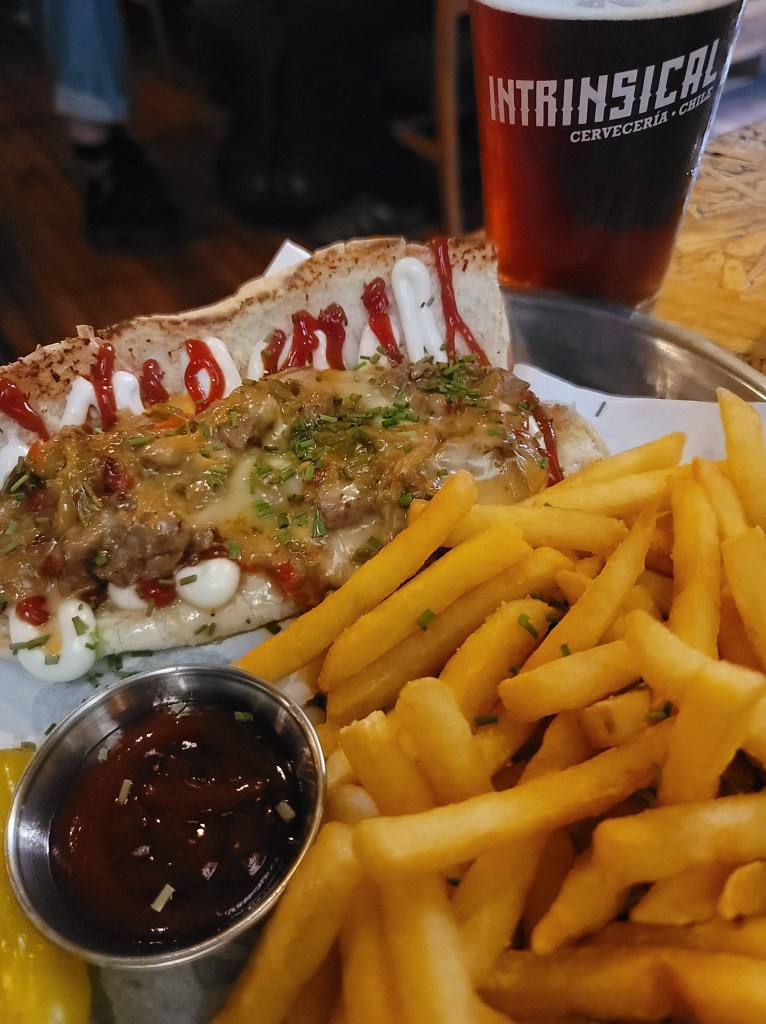 Once we realized how crunched for time we were, a quick google search for breweries in central Santiago led me to Cerveceria Intrinsical. If you’re looking for a unique and exciting beer experience in Santiago, Cerveceria Intrinsical is a wonderful stop. This brewery is known for its innovative and experimental approach to brewing, using local ingredients like quinoa and aji peppers to create distinctive and delicious beers. With a rotating selection of beers on tap, there’s always something new to try (I’ve been following them on Instagram since our visit and everything looks to die for). The brewery also offers tours and tastings, giving visitors a chance to learn about the brewing process and sample some of their unique and flavorful beers. The staff was amazingly friendly and knowledgeable (shout out to Carola, who was super kind). Knowing that we had a long flight to Mexico City ahead of us, we had grabbed some food to pair with our beers. David had a completo ( A Chilean style hotdog) and I snagged a Philly Collins (their take on a cheesesteak). Both were absolutely phenomenal and paired well with our beer choices– a Kölsch and an Altbier.