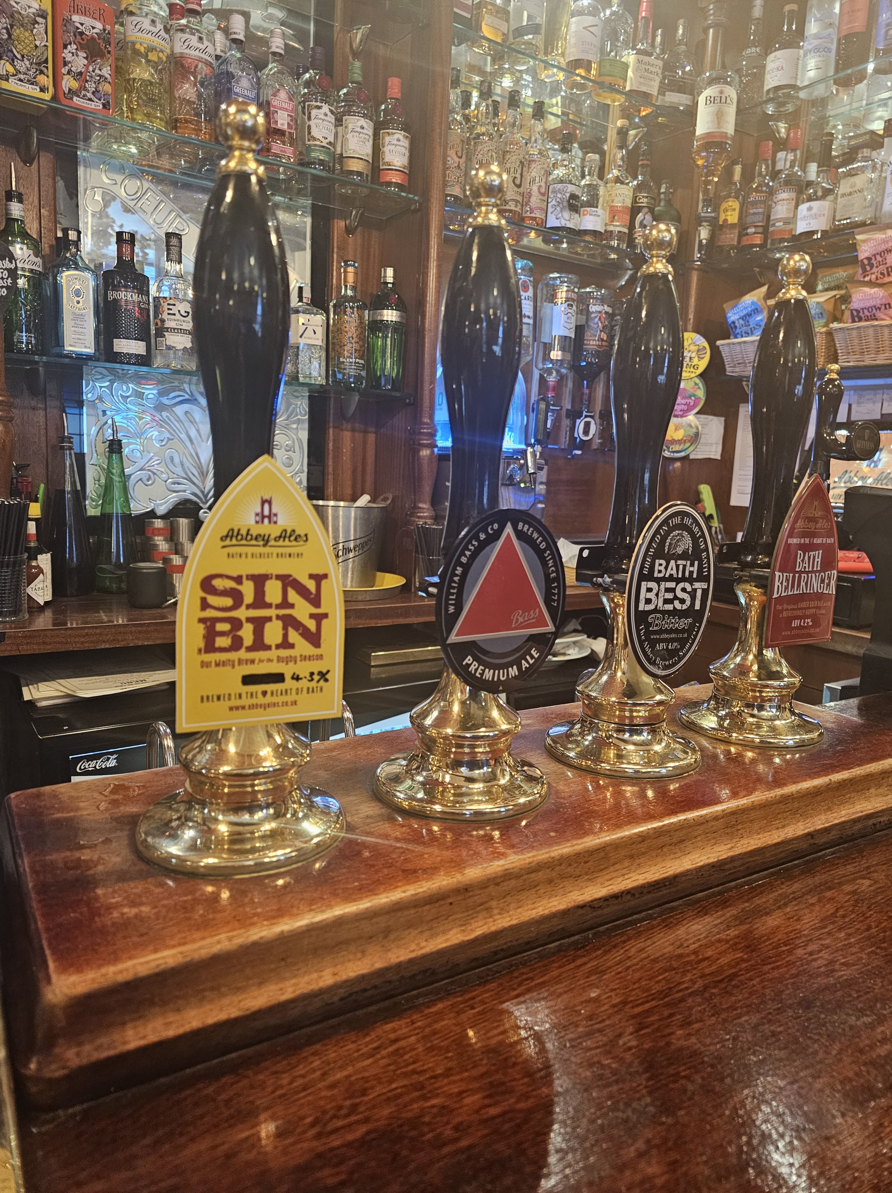 While we were in Bath, we wanted to try some local, craft beer and the one brewery that I could find in the area, Abbey Ales, was a little out of town and didn’t seem to have a tasting room. This is somewhat of a theme with UK breweries, they have pubs that are tied to them (tied-house), rather than their own tasting rooms– this is changing with the current craft scene, though. So, we found out that they had a brewery shop in town… and misread the hours. Luckily, one of those tied houses happened to be next door, the Coeur de Lion. The tiny pub (some claim the smallest in Bath) had a few of the Abbey Ales on , as well as stalwarts like Bass. I enjoyed the Bath Best, a Best Bitter, on cask and David had the Sin Bin, a beer brewed especially for the rugby season.