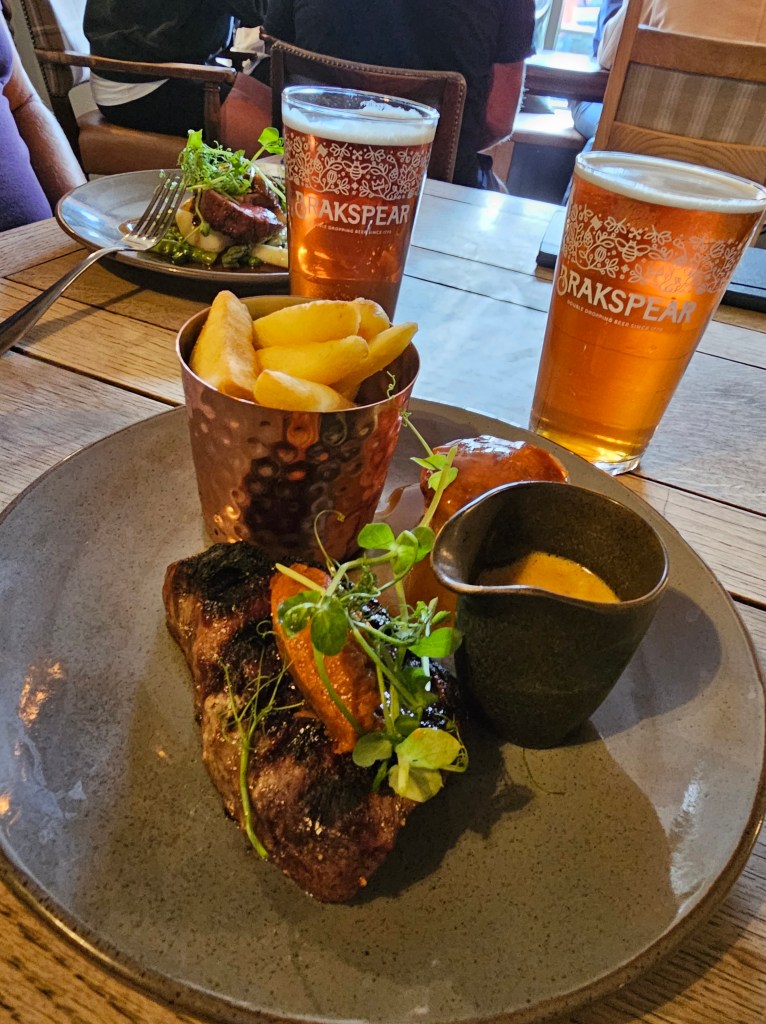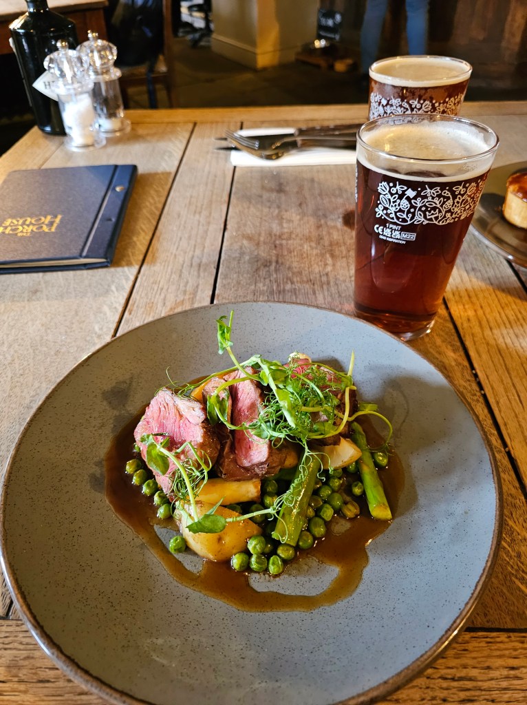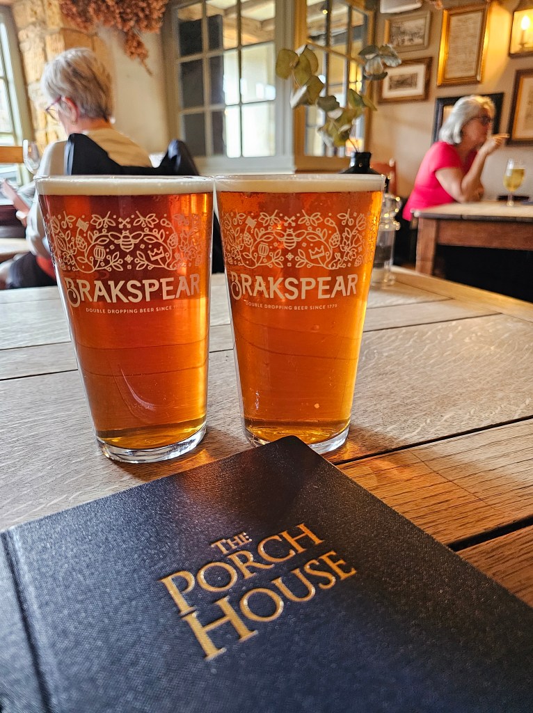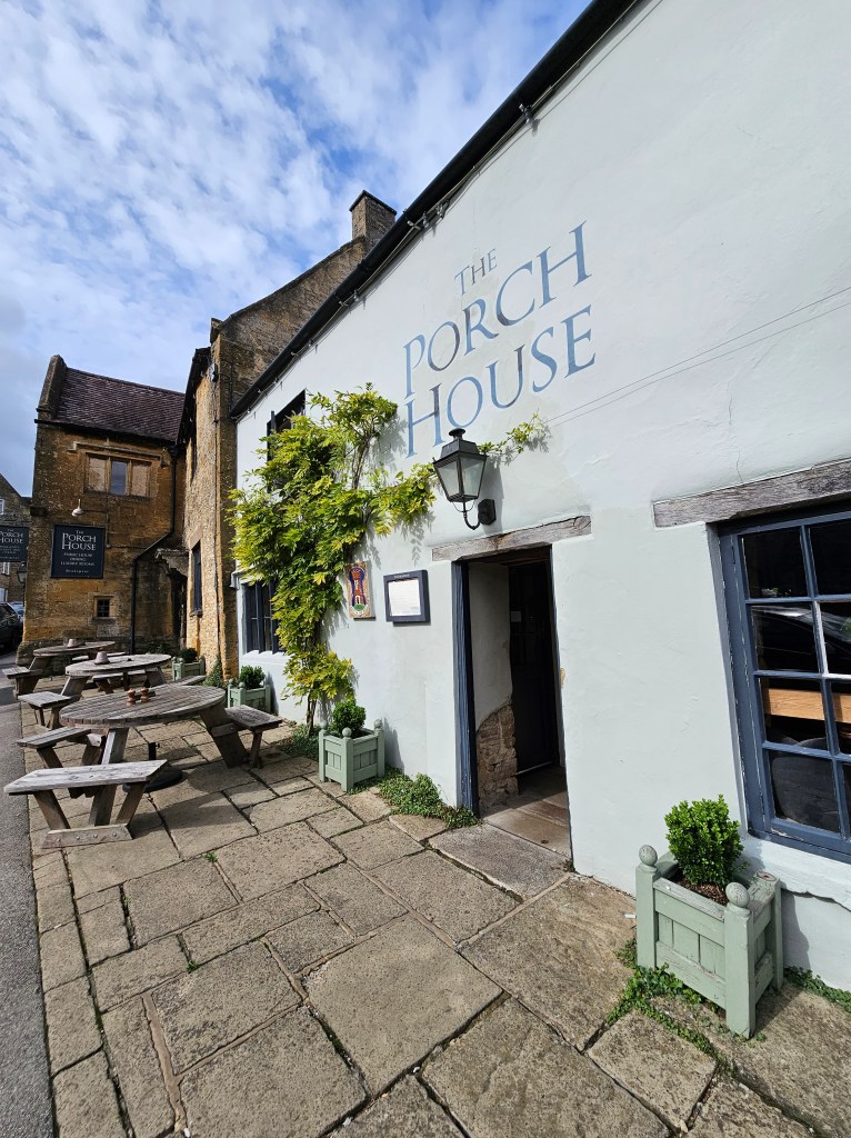We enjoyed a delicious meal at The Porch House, one of England’s oldest inns. Nestled in the heart of Stow-on-the-Wold, The Porch House exudes timeless charm with its rustic rooms adorned with beautiful dried hops. As we indulged in a sumptuous lunch featuring pavé of venison accompanied by dauphinoise potatoes and a succulent 8oz dry aged rump steak paired perfectly with kkin-on seasoned fries, all washed down with two refreshing Shakespeare ales, we couldn’t help but feel transported through the centuries. With a history dating back to the 10th century, The Porch House stands as a testament to England’s rich heritage, offering not just a meal, but an immersive experience steeped in tradition and flavor.