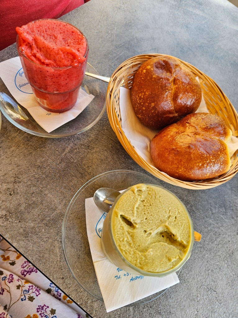The next morning, we discovered the highlight of our culinary adventure in Aci Trezza—the first and best granita of our entire Sicily trip at Gran Cafe Solaire. Served with warm, soft brioche, this traditional Sicilian breakfast treat was an absolute delight. David chose a refreshing strawberry granita, bursting with natural sweetness, while I indulged in a creamy pistachio flavor that was rich and nutty. The combination of the icy granita with the fluffy brioche was simply unforgettable. It was the perfect way to start our day, setting the bar high for the rest of our Sicilian granita experiences.