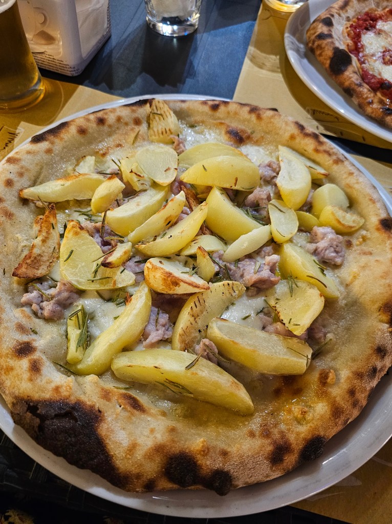 While our time in Aci Trezza was short, we made sure to see the town the best way we know how—through our stomachs. Our culinary journey began with a delightful dinner at Venere Pizza, a local favorite known for its unique and delicious pizzas named after Greek and Roman gods. Each pizza is a masterpiece, reflecting the divine names they carry. As is customary in Italy, everyone gets their own pizza, allowing us to savor the intricate flavors of our individual choices. The crust was perfectly thin and crispy, the toppings fresh and flavorful (potatoes on a pizza– I’m retiring here). It was a heavenly experience worthy of the gods themselves.