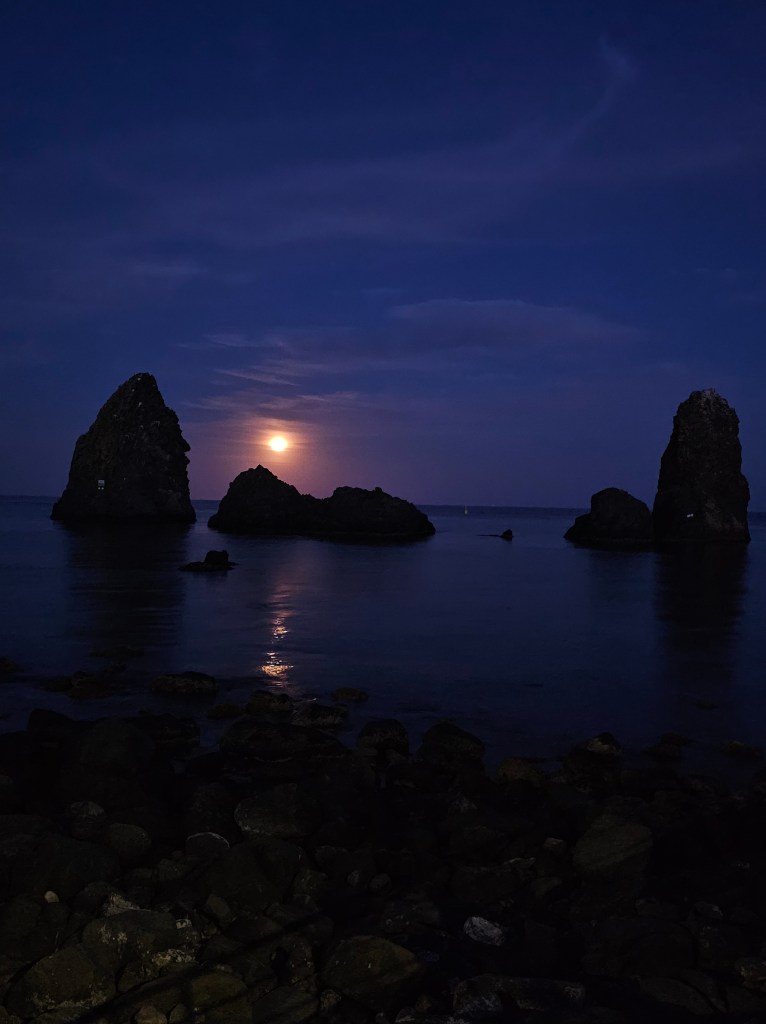The water promenade in Aci Trezza is another highlight that should not be missed. This charming walkway stretches along the coastline, offering panoramic views of the Ionian Sea and the Cyclopes Rocks in the distance. Lined with quaint cafes and restaurants, it’s an ideal spot to enjoy a leisurely meal while soaking in the serene maritime atmosphere. As you stroll along the promenade, you’ll encounter local fishermen mending their nets and boats bobbing gently in the harbor, providing a glimpse into the daily life of this coastal village. The promenade is especially enchanting at sunset, when the sky is painted in hues of orange and pink, casting a magical glow over the sea. We had the absolute joy of watching a full moon rise of the rocks from the promenade, a hauntingly beautiful sight.