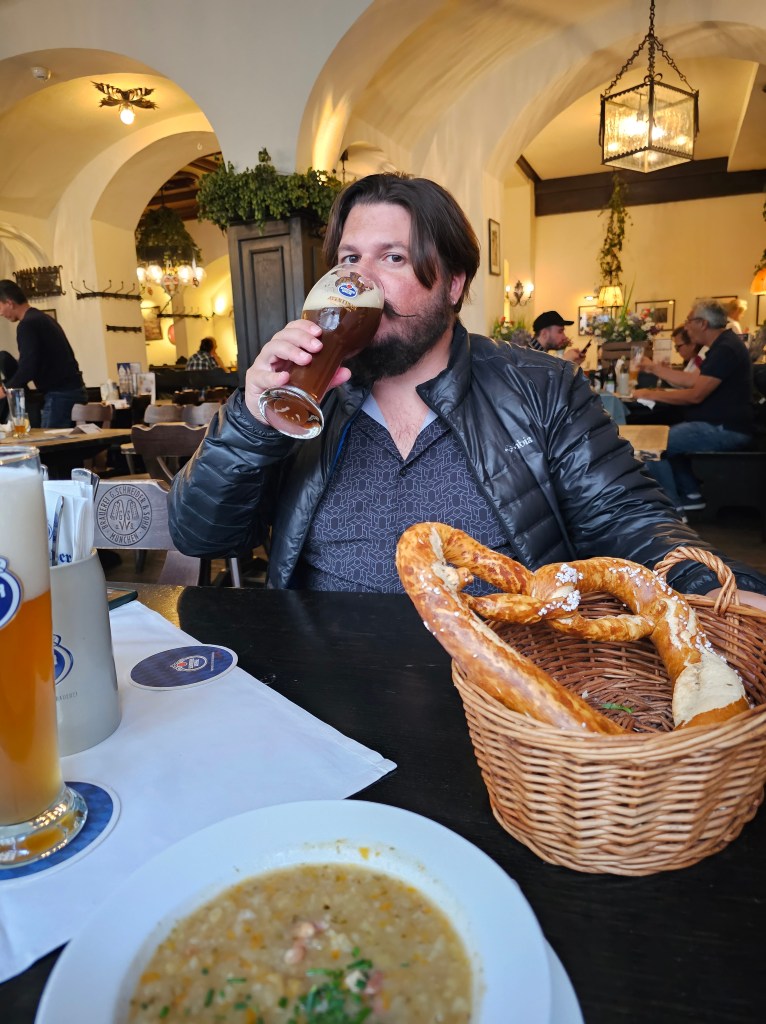 After all that walking, we headed to Schneider Bräuhaus, one of the city’s most beloved breweries. This historic brewery makes David’s favorite beer, Aventinus, a rich, malty weizenbock that’s perfect for fall. We settled into our seats with a round of beers and enjoyed the sounds of a live Bavarian band. The meal was a feast of traditional dishes—festival chicken, giant pretzels, and hearty portions that left us perfectly satisfied. Schneider Bräuhaus is the kind of place where time slows down, and you can savor both the flavors of Bavaria and the lively, warm atmosphere of the beer hall.